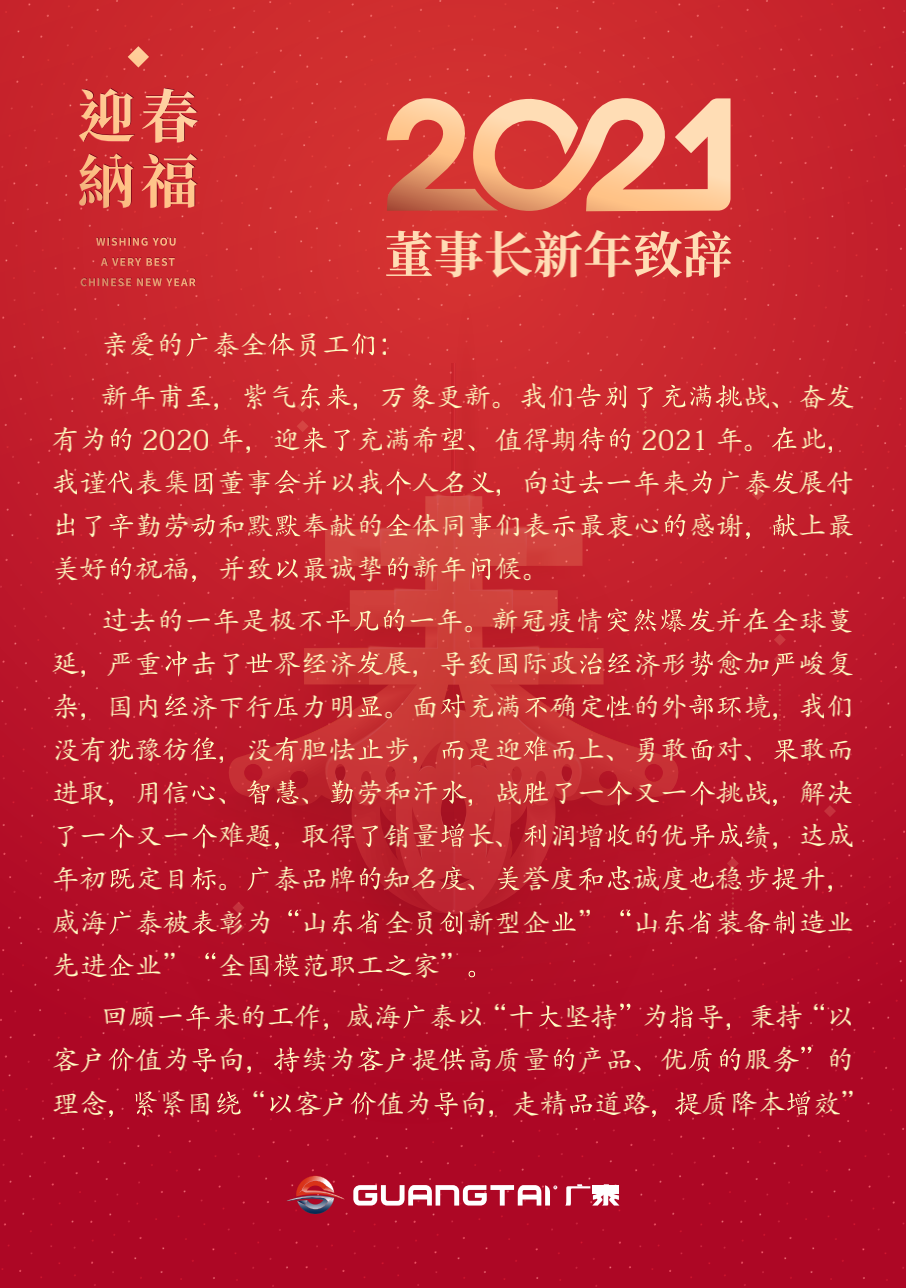 威海廣泰始終秉承“人才是企業(yè)發(fā)展之資本”。踐行“大人才觀”,甄選高度責(zé)任感而又創(chuàng)新思考的人,著力打造具有全球視野的精英團(tuán)隊(duì),全面支撐公司戰(zhàn)略實(shí)施。