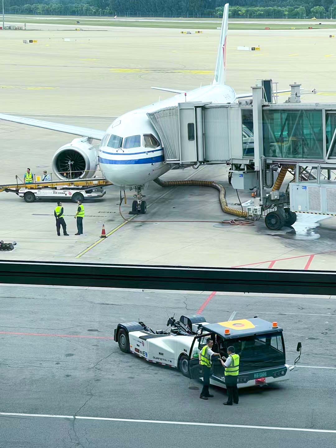 當(dāng)飛機(jī)緩緩穿過“水門”,順利對(duì)接T4航站樓410廊橋位時(shí),一場由綠色科技驅(qū)動(dòng)的“地面保障盛宴”隨即上演。此時(shí),威海廣泰電動(dòng)傳送車、電動(dòng)飛機(jī)牽引車等先進(jìn)裝備紛紛亮相,它們以零排放、低噪音的優(yōu)勢,為C919的地面服務(wù)提供了“綠色支撐”。廣大航服杭州事業(yè)部保障人員提前對(duì)威海廣泰車輛進(jìn)行了嚴(yán)格的性能預(yù)檢,并提供了全程陪伴服務(wù),確保了整個(gè)保障流程的萬無一失。