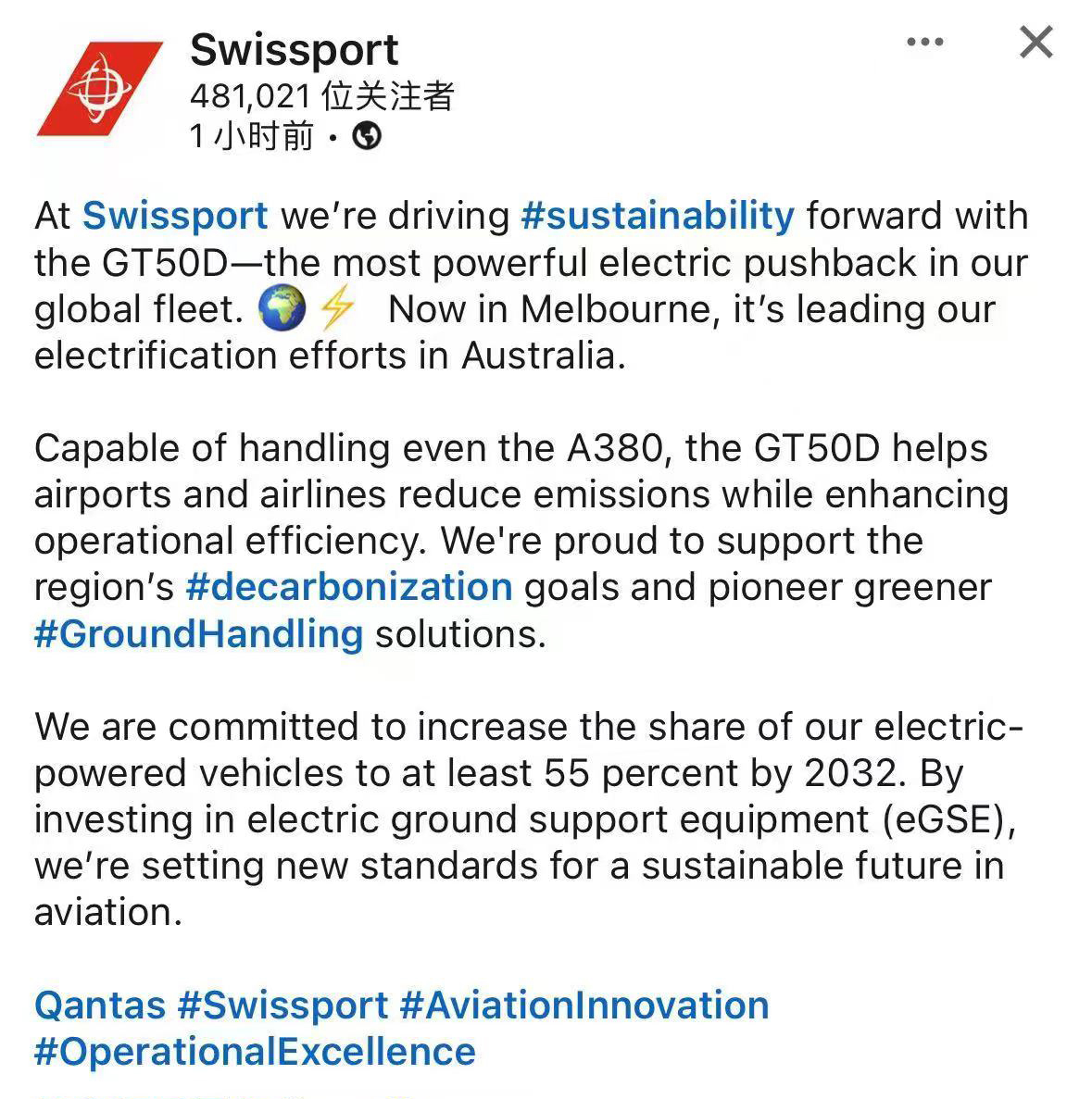 swissport通過引入GT50D(威海廣泰電動(dòng)50噸飛機(jī)牽引車)推進(jìn)航空領(lǐng)域的可持續(xù)發(fā)展。這是其全球車隊(duì)中最強(qiáng)大的電動(dòng)飛機(jī)牽引車。GT50D現(xiàn)在在澳大利亞墨爾本投入使用,它正在引領(lǐng)我們?cè)诎拇罄麃喌碾姎饣M(jìn)程中不斷努力。