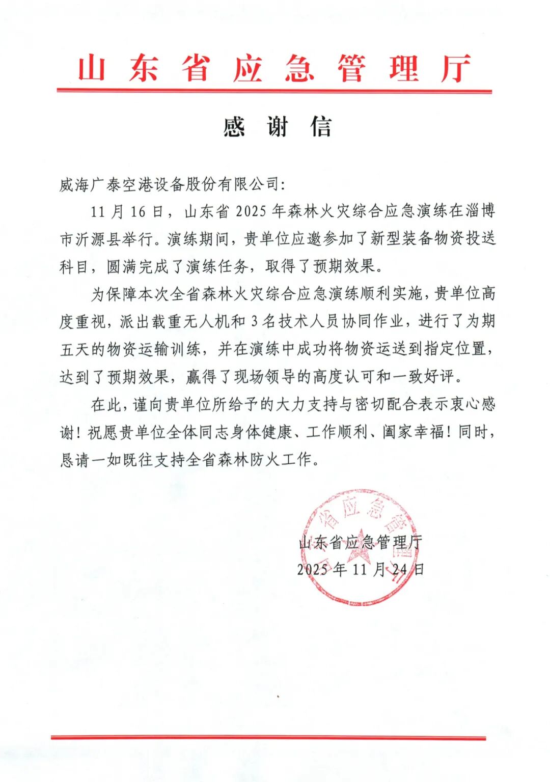 近日,威海廣泰空港設(shè)備股份有限公司(簡稱"威海廣泰")受山東省應(yīng)急管理廳邀請參加2025年山東省森林滅火綜合應(yīng)急演練,威海廣泰瑤光無人機團隊以高標準保障演練順利舉行,并榮獲山東省應(yīng)急管理廳頒發(fā)的感謝信。