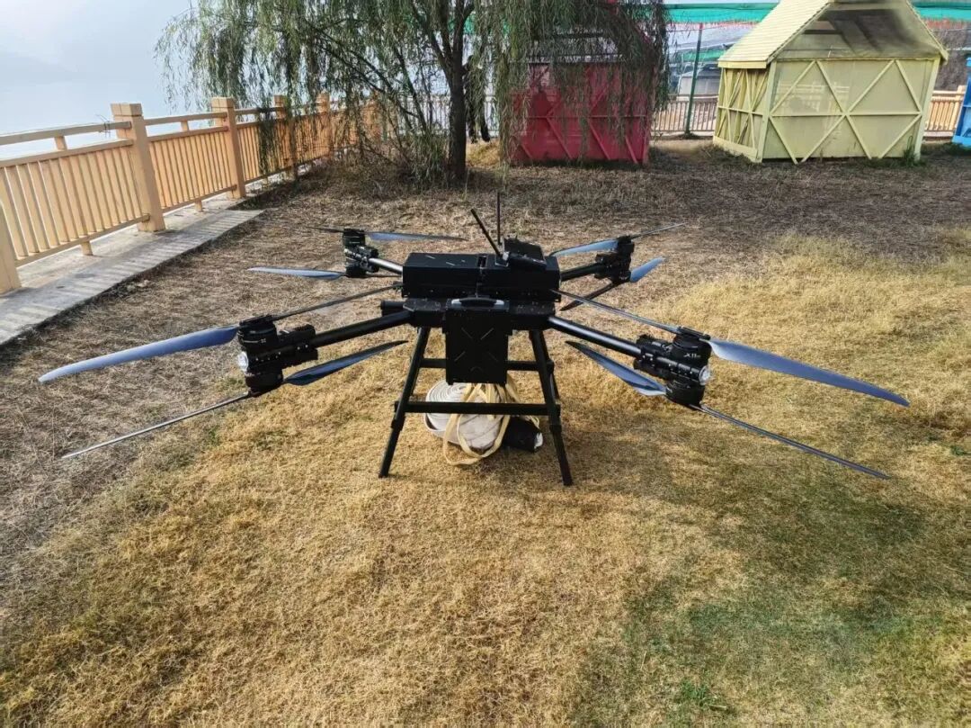 在火場核心區(qū)域上空,瑤光無人機平穩(wěn)懸停,通過先進的吊運系統(tǒng),將水帶、高壓水泵、環(huán)保型滅火劑、急救藥品等關(guān)鍵救援物資安全投送至指定接收點,有效解決了火場前沿“物資斷供”的緊急難題,為后續(xù)地面消防隊伍的攻堅滅火提供了及時且可靠的物資保障。